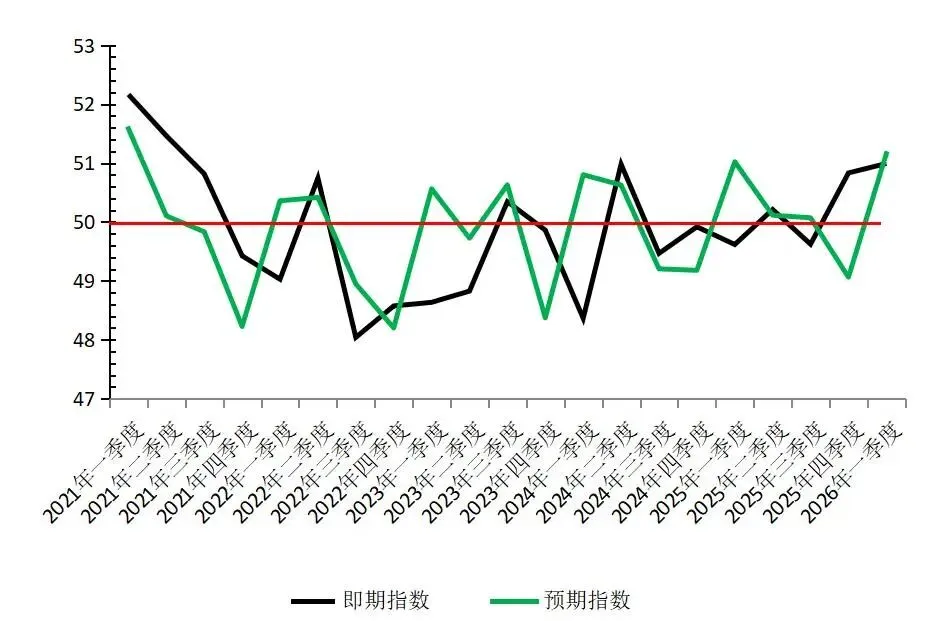 2026年一季度有色金属企业信心指数为51.1,较上季度上升1.3个点,高于临界点50。值得注意的是,这是该指数自去年连续3个季度下降之后的首次上升,且指数再次进入扩张区间。从指数构成来看,一季度即期指数与预期指数呈现“双升”的态势,即期指数为51.0,较上季度上升0.2个点;预期指数为51.2,较上季度上升2.1个点,显示有色企业当前经营状况有所改善,且对行业未来发展保持信心。具体情况详见图1和图2。