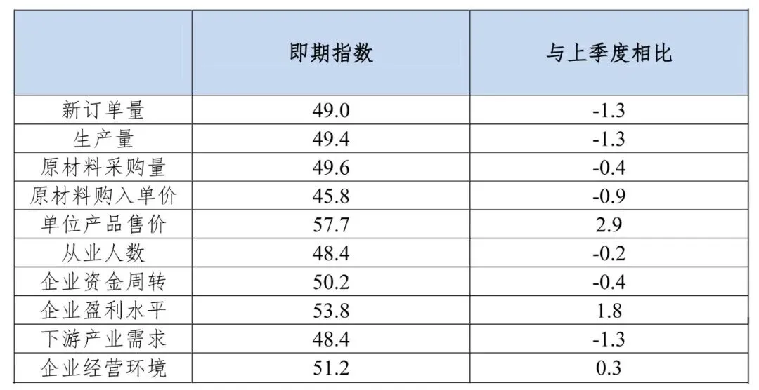 一季度即期指数为51.0,较上季度上升0.2个点。由表1可知,10项指标中4项指标位于临界点50以上,有3项指标出现上升,分别是单位产品售价、企业盈利水平和企业经营环境,升幅分别是2.9、1.8和0.3。有7项指标出现下降,降幅明显的前三位分别是新订单量、生产量和下游产业需求,降幅均为1.3。
