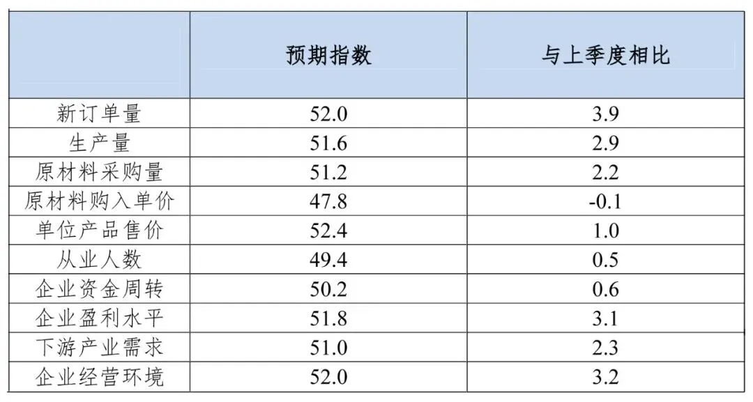 一季度,生产量预期指数为51.6,较上季度上升2.9个点。其中,21.0%的企业认为未来企业的生产量比上季度“增加”,71.0%的企业认为未来企业的生产量与上季度“基本持平”,8.1%的企业认为未来企业的生产量比上季度“减少”。