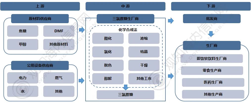 三氯蔗糖的主要生产采用化学合成法,以蔗糖为原料,结合DMF、甲醇等化工原料,经酯化、氯化、脱色、醇解、浓缩、结晶等工序制得高纯度产品,广泛应用于食品、饮料及医药个护领域。三氯蔗糖下游主要应用于食品行业,包括饮料、乳制品、冰淇淋、调味品、烘焙等。除了食品行业外,三氯蔗糖也逐步被医药、个护等领域的生产厂商所接受并应用于药品、牙膏、化妆品等产品中。