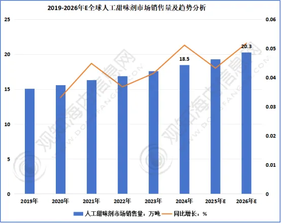 根据数据显示:近几年全球人工甜味剂呈现上升趋势,市场销售量从2019年15.1万吨上升至2024年18.5万吨,2019-2024年年复增长率为4.15%。人们生活水平的提高也促进了对口味丰富的食品饮料的需求日益增长,预计2026年全球人工市场销售量将突破20万吨,同步增长4.1%。