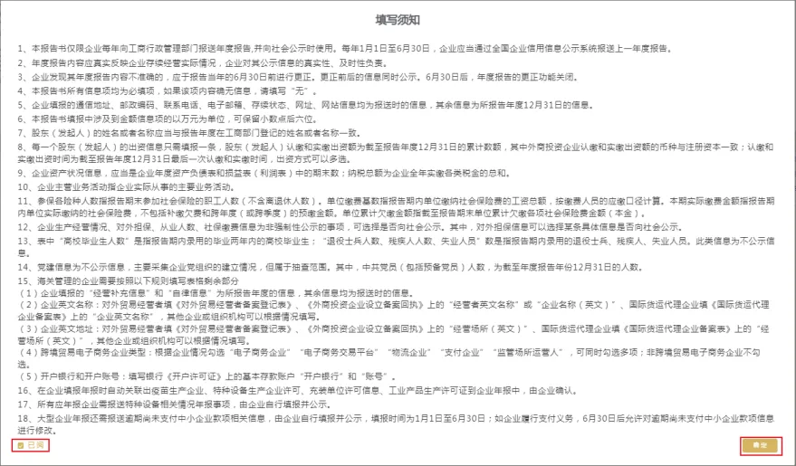 弹出年报须知,阅读后,在下方“已阅”前的小框内“√”(对勾),再点确认。如果以前存在没有参加年报的年度,先需要将以前年度补报后才可申报本年度的。