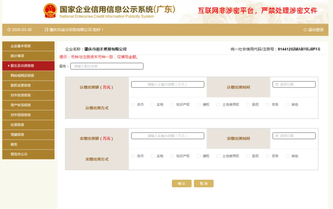 四、填写股东及出资信息,点击“添加”进行填写。(分公司无需填写)按照公司章程上约定的填写股东出资额及出资时间,每一个股东(发起人)的出资信息只需填报一条,股东(发起人)认缴和实缴出资额为截至报告年度12月31日的累计数额;认缴和实缴出资时间为截至报告年度12月31日最后一次认缴和实缴时间,出资方式可以多选。点击“保存”。如还未发生实缴,则实缴部分暂时不需填写,填写认缴信息后即可保存。注意:系统默认填写数额单位为万元,填写时要注意核对数额大小准确性!只填写数字即可,不要在数字后面加“万”字,否则不能保存。