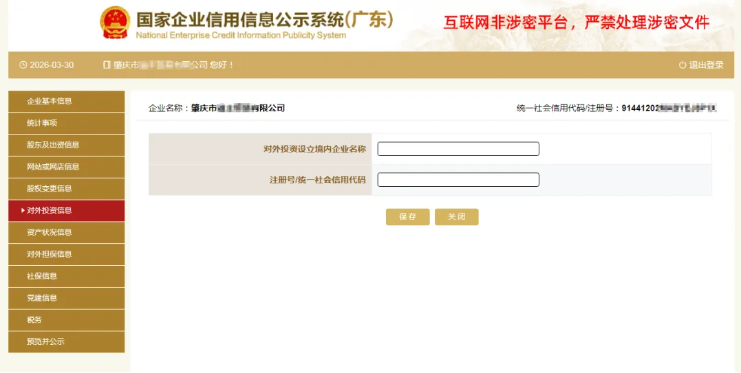 六、填写对外投资信息。点击左边的“对外投资信息”,之后再根据实际情况点击“添加”填写相关信息,填写完成后完点击“保存”。如无对外投资情况变更的则无需填写此项信息。