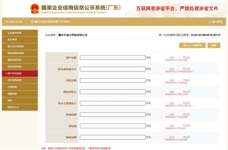 根据审计报告、资产负债等如实填写企业资产状况,若选择“公示”则对外公示,若选择“不公示”,则公示查看该指标不对外公示,显示“不公示”。