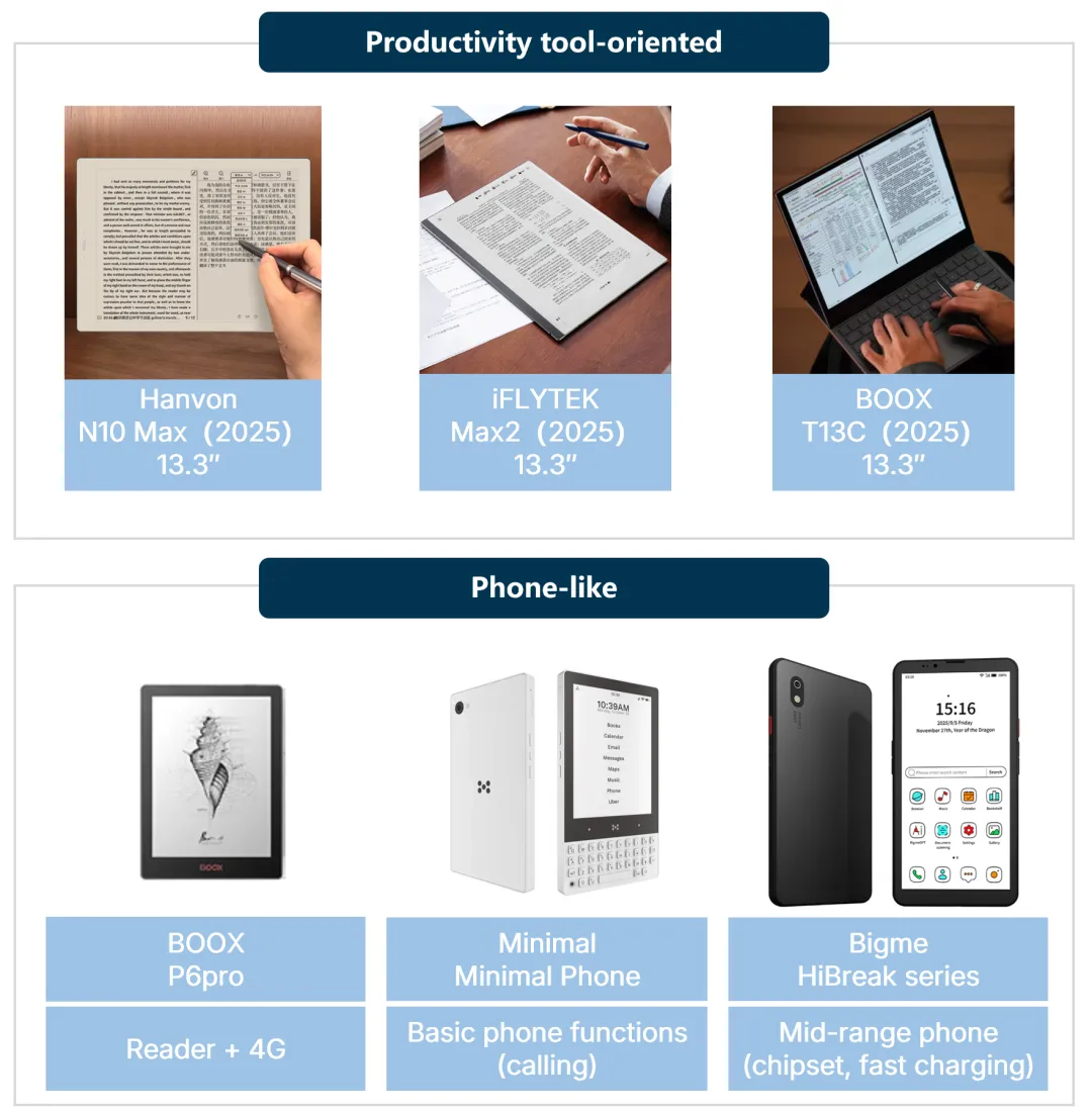 产品端:正从“阅读工具”升级为融合办公效率与移动互联的新型智能终端,呈现出生产力工具化和类手机化等两大演进趋势。