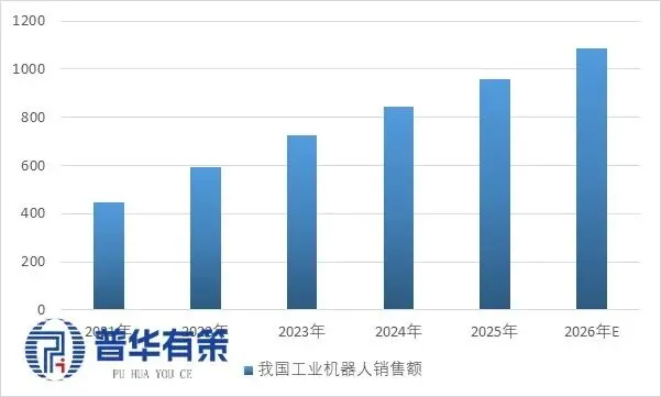 近年来中国工业机器人市场规模持续增长,销售规模自2020年的476.26亿元增长至2025年950亿元左右,年均复合增长率为16.77%,预计到2026年将突破1000亿元。