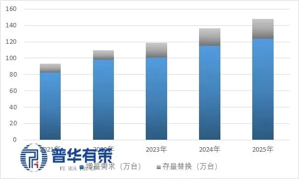 2021-2025年度我国工业机器人减速器总需求量从93.11万台增长至150万台左右,年均复合增长率为13.63%,其中增量需求从82.41万台增长至125万台左右,年均复合增长率为11.89%。随着数字化进程的加快推进,机器换人将受益其中,减速器作为推动我国工业自动化进程、助力产业升级和智能制造的核心零部件,长期发展趋势向好。
