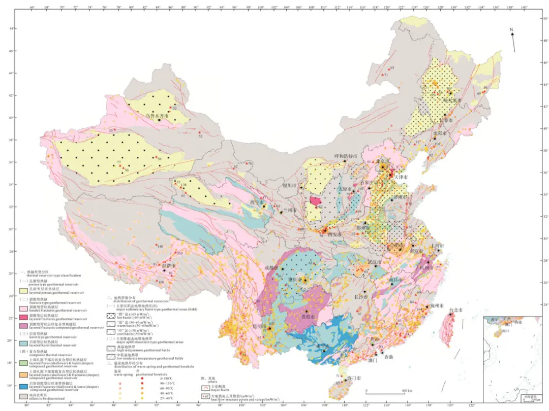 地热能是一种清洁低碳的可再生能源,具有分布广、储量大、清洁低碳、持续稳定等特点。我国地热资源储量丰富,约占全球地热资源的1/6,并以中低温为主,分布情况如图6-15所示。根据地热资源埋藏深度分类,当前可利用的地热能主要分为浅层地热能、中深层地热能以及超深层地热能。其中,浅层地热能一般指温度低于25℃,深度小于200米的地热能。广义可指各类土壤源和水源热泵系统,也叫“浅层地温能”。其主要利用形式包含浅层地埋管、浅层井下换热器、浅层单井抽灌等。