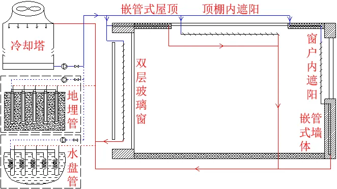 在冬季,土壤温度低于室内热舒适区的空气温度,难以直接用于加热室内空气,但其温度在一些时间高于围护结构的温度,具有降低围护结构负荷的应用潜力。图6-16为利用浅表层地热能的单层嵌管围护结构系统示意图。在冬季,该系统将浅表层地埋管产生的低品位热水输送到单层嵌管墙、嵌管屋面及嵌管窗等位置,拦截通过围护结构由室内向室外环境的耗热量,降低需要机械冷热源处理的负荷,从而降低供热系统能耗。