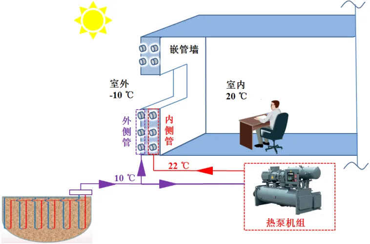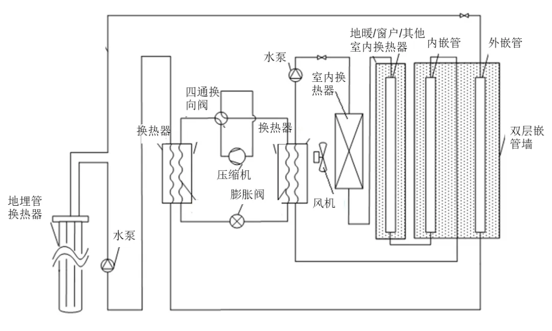 除了与单层嵌管墙结合,浅表层地热能还可以直接用于双层嵌管墙外侧嵌管,实现围护结构负荷的高效拦截。进一步,双层嵌管墙内侧嵌管可以利用地源热泵产生的低温热水(略高于室温、低于传统供热末端水温)向室内直接供热。得益于热泵制取热水温度的降低,热泵能效可以大幅度提升,实现显著的节能效果。