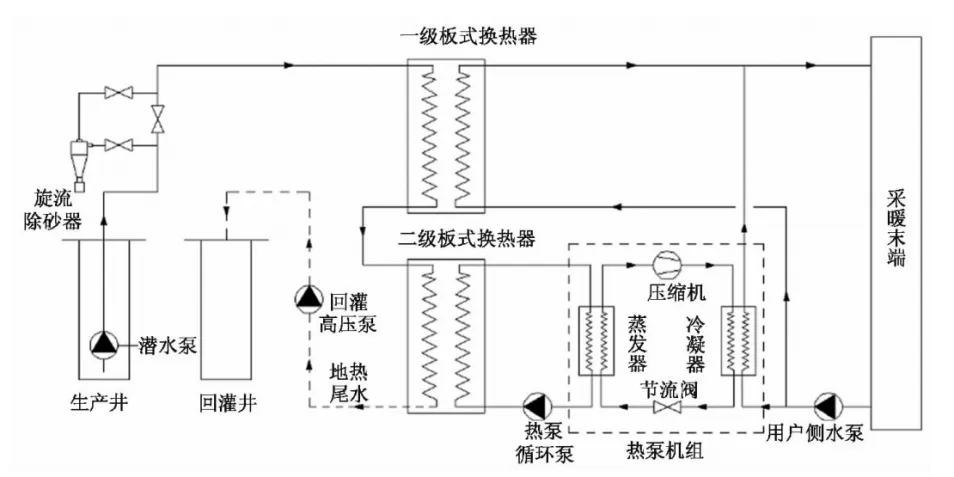 目前对于中深层地热资源,普遍采用水热型地热资源直接利用的形式,通过开采3000米左右地热井获得较高温度的热水或蒸汽进行直接供热,或结合热泵对获得的不够高温度的热水进行温度提升,以用于北方地区供热[15]。如图6-19所示,展示了地热水结合热泵实现地热能梯级利用的系统形式。