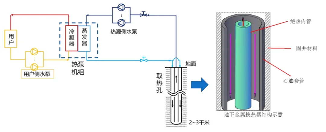 近年来,采用间壁式换热的方法,提取中深层地热能用于供热的技术在陕西等地率先建成,并逐渐建成多个技术示范项目。如图6-20所示,该技术通过向地下2000~3000米的岩层钻孔、固井,随后在钻孔中安装封闭的套管结构换热器,外管采用不锈钢金属套管,内管采用绝热材料的保温内管,构成中深层地热地埋管[17]。系统在运行时,热源水在水泵的驱动下,从外套管向下流动,通过外管壁与周围土壤换热,随后从内管流出,通过间壁式换热的形式提取中深层地热能。此时由于换热器换热面积有限,热源侧出水温度尚不足以直接供热。因此地面结合相应的热泵供热系统,一方面提升供水温度,同时降低地埋管进水温度,实现更大的取热量。