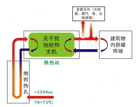 上述供热方式均为传统高温形式供热技术,由于水热型地热能开采形式水温较高,可用于直接供热,但该利用形式对地热资源禀赋要求较高,不具有普适性。并由于回灌困难、地下水污染等问题,难以大面积推广。