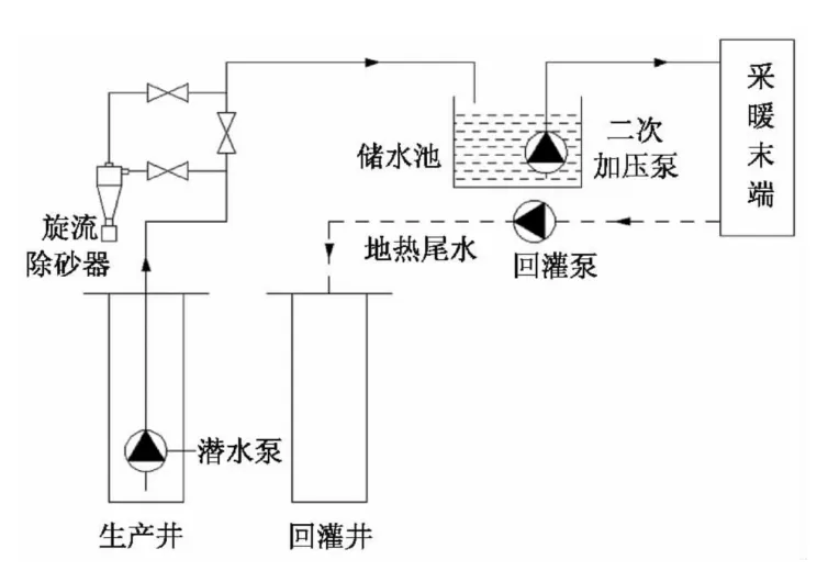 a)地热水用于直接供热:利用深井潜水泵从生产井抽取中深层地热水,经输水管网送至储水池,然后通过二次水泵将水加压直接送至采暖末端进行供暖,降温后的地热水经输水管网送至回灌井进行回灌,如图6-23所示。
