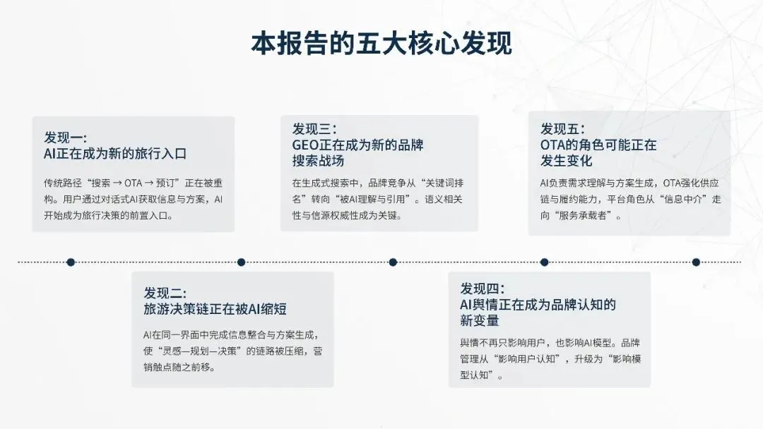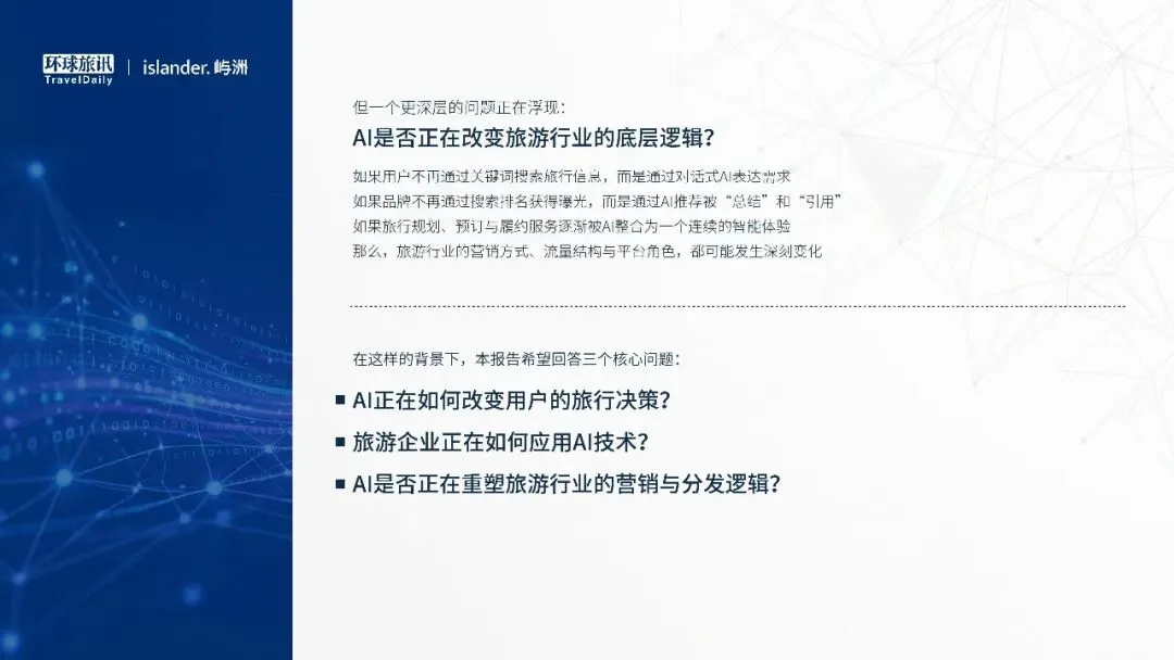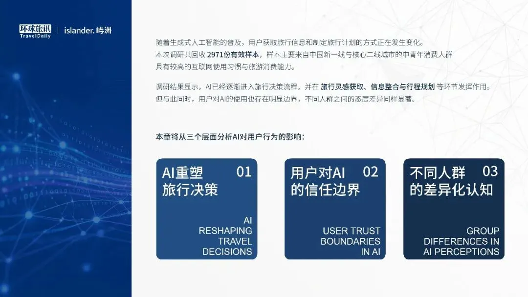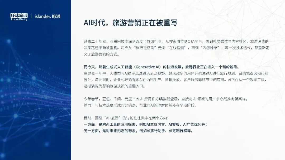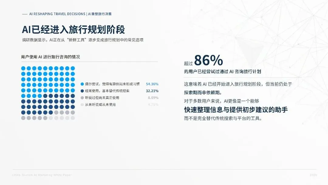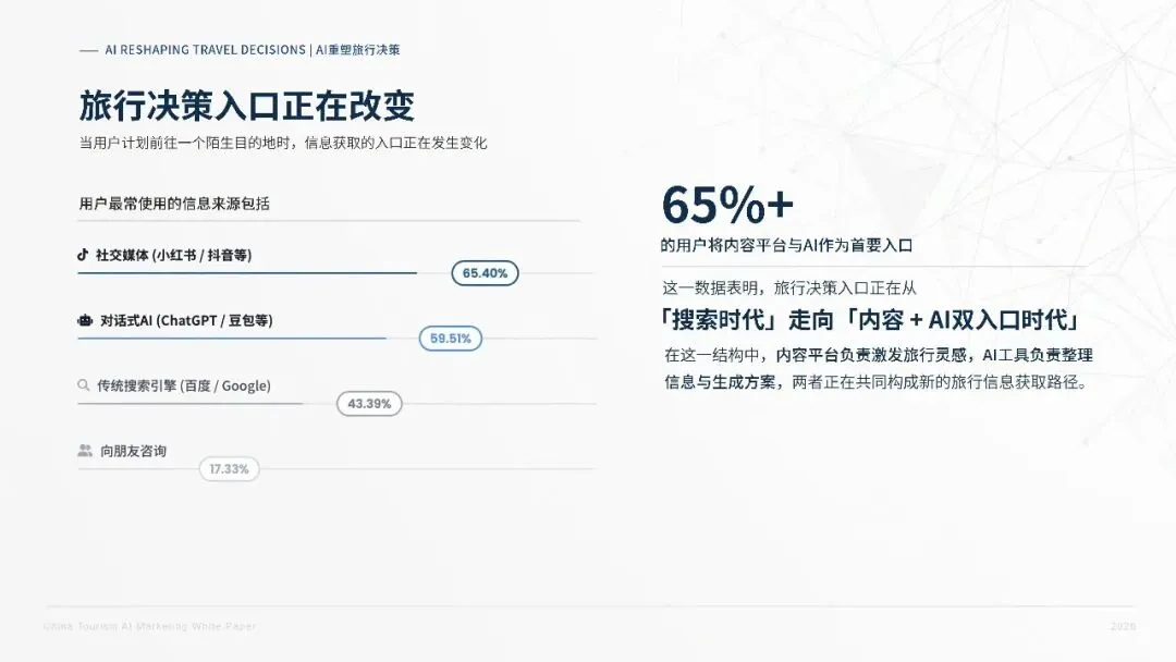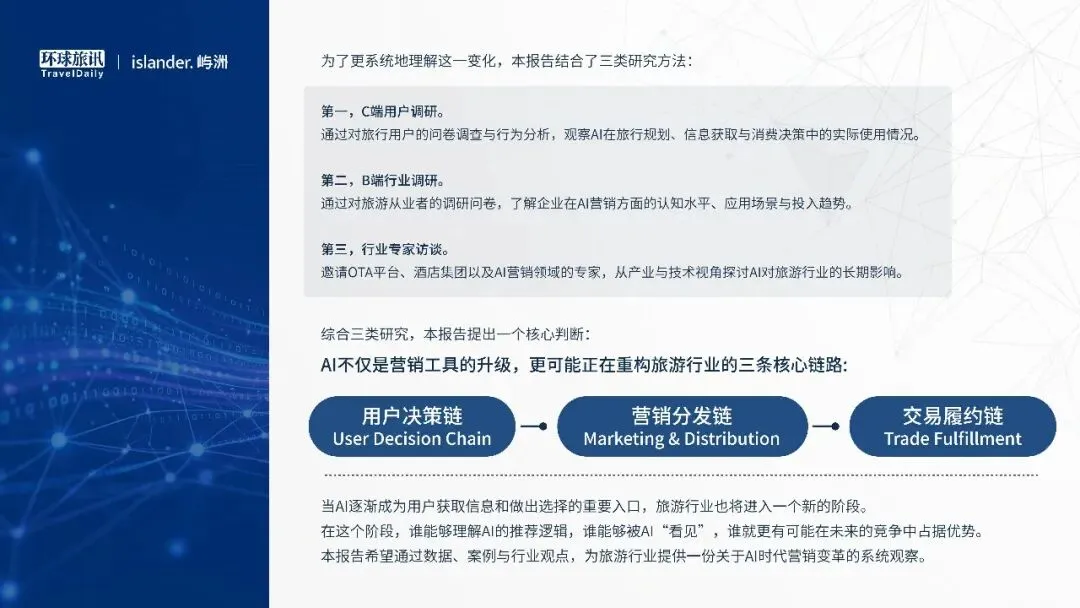 生成式人工智能的快速发展,正推动旅游行业迈入全新发展阶段,AI从效率工具逐步演变为影响旅游决策的重要入口,也让行业对其认知与应用探索进入关键期。本报告立足AI对旅游行业的深度影响,围绕AI如何改变用户旅行决策、旅游企业如何应用AI技术、AI是否重塑行业营销与分发逻辑三大核心问题,综合C端用户调研、B端行业调研与行业专家访谈三类研究方法,系统探究AI对旅游行业的变革价值。研究发现,AI正重构旅游行业的用户决策链、营销分发链与交易履约链,不仅推动用户旅行决策入口与路径发生深刻变化,也让旅游企业的AI应用从基础效率工具向流量入口探索过渡,同时催生GEO等全新行业发展概念与实践方向。本报告通过数据、案例与行业观点,呈现AI时代旅游营销的变革特征与发展趋势,为理解旅游行业的AI化发展提供系统性观察与参考。