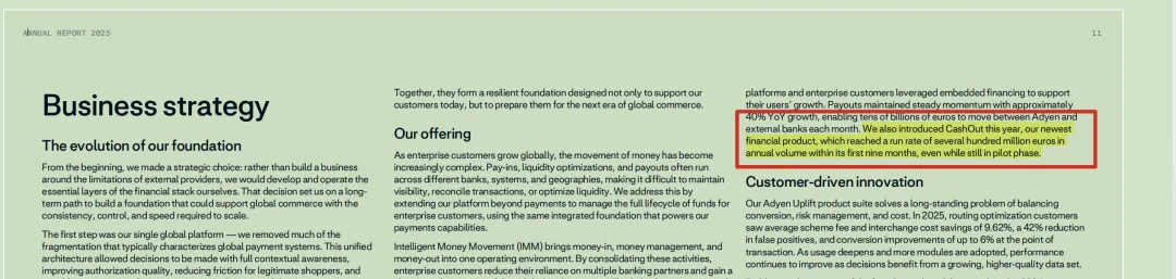)。 看到很多不认识的单词,好难过。希望在出来2026新一年财报前看完吧。 We also introduced CashOut this year, our newest financial product,which reached a run rate of several hundred million euros in annual volume within its first nine months,even while still in pilot phase。 -->今年,我们还推出了最新的金融产品CashOut,尽管还处于试点阶段,但在前9个月就达到了数亿欧元的年运转率。 | |