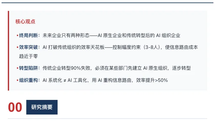 本报告的核心论点是:未来企业只有两种形态——AI 原生企业和传统转型后的 AI 组织企业。