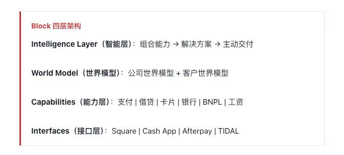 Block(前 Square)是美国金融科技公司,运营双边平台:Cash App(消费者)+ Square(商户)。其组织架构采用四层模型: