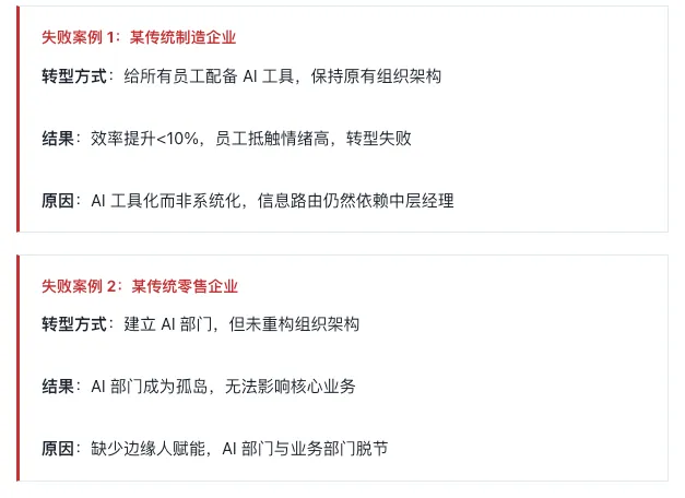 :试图在传统金字塔式组织上叠加 AI 工具,而非重构组织逻辑 - AI 工具化而非系统化