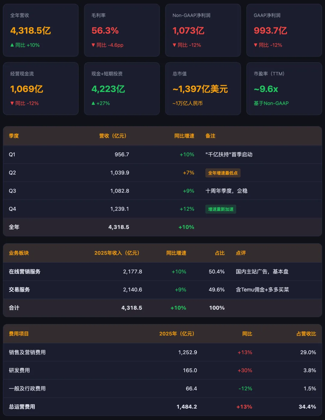 2025年的事实也说明了这一点:拼多多主动降低了商家费率("千亿扶持"的一部分)。管理层心里很清楚:保持商家生态健康比短期利润更重要。