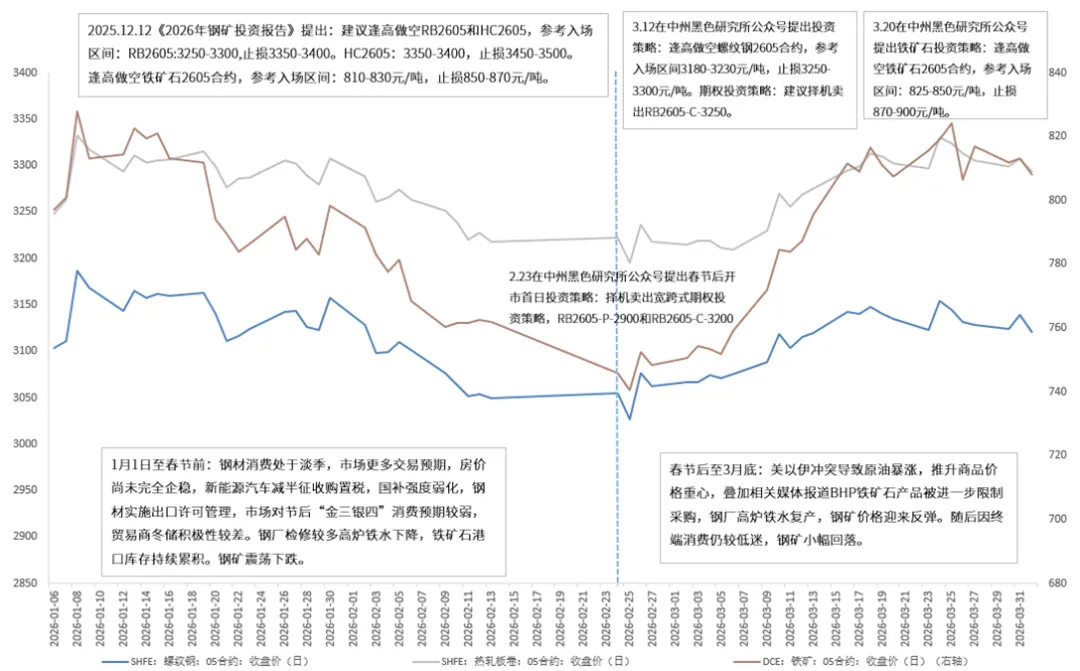 春节后至3月底钢矿市场走势及投资策略回顾:美以伊冲突导致原油暴涨,推升商品价格重心,叠加相关媒体报道BHP铁矿石产品被进一步限制采购,钢厂高炉铁水复产,钢矿价格迎来反弹。随后因终端消费仍较低迷,钢矿小幅回落。此期间投资策略回顾:3.12在中州黑色研究所公众号提出投资策略:逢高做空螺纹钢2605合约,参考入场区间3180-3230元/吨,止损3250-3300元/吨。期权投资策略:建议择机卖出RB2605-C-3250。螺纹钢大方向判断正确,价格未达入场区间。3.20在中州黑色研究所公众号提出铁矿石投资策略:逢高做空铁矿石2605合约,参考入场区间:825-850元/吨,止损870-900元/吨。大方向和入场区间均得到铁矿石市场验证。
