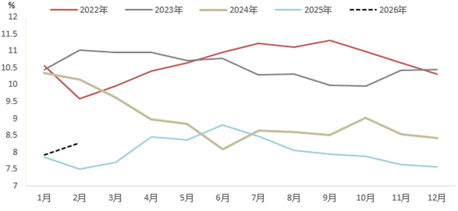 据中国人民银行数据,今年前2个月,社会融资规模增量累计为9.6万亿元,同比多增3162亿元,存量增速为8.2%,与去年同期持平。得益于2026年财政政策靠前发力,新增政府债券规模达12万亿新高,专项债和国债发行节奏加快。1-2月人民币新增贷款累计同比增加5.61亿元,同比少增约5300亿元,人民币新增贷款在社融中的比例有所下降。这说明当前社会融资规模的增长更多依赖财政发力,而非银行信贷的扩张。从贷款结构来看,企业端贷款较强,居民端贷款仍偏弱。总体来看,当前流动性总量充裕,结构上财政政策正成为宽信用的主力。 社融的平稳增长主要依赖政府债券发行,企业贷款在政策引导下投向基建和部分制造业,但居民部门融资需求依然疲软,反映出内需修复仍不均衡。中国人民银行今年将继续实施“适度宽松”的货币政策,加强与财政政策的协同。考虑到贷款利率已处低位、M1回升释放积极信号,同时原油价格大涨后美联储降息概率大幅下降,国内进一步降准降息的次数和幅度可能也将调整。