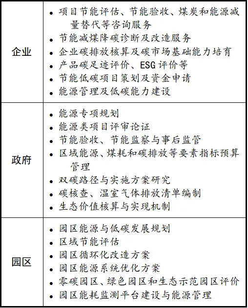 围绕国家碳达峰、碳中和目标的工作要求,全面服务于政府、园区、企业、项目四个层面的节能评估咨询、碳评价、项目谋划策划、区域能源规划、低碳技术应用、课题研究、能源和碳排放能力建设等领域,提供区域经济全面绿色转型的一揽子解决方案。