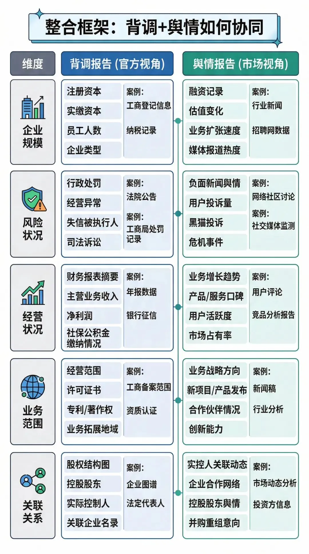 答案:两者都不完整。背调擅长"官方视角",舆情擅长"市场视角",只有将两者整合,才能拼出企业的完整画像。
