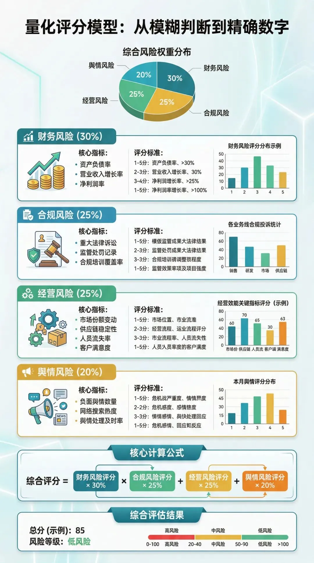 量化评分替代模糊判断 风险敞口量化潜在损失 场景化建议可直接执行