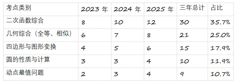 几何综合题保持稳定,占比约25%,但考查内容更加综合