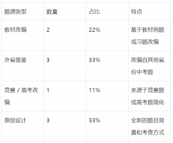 2.教材改编占比相对较低,说明压题更注重创新而非简单改编