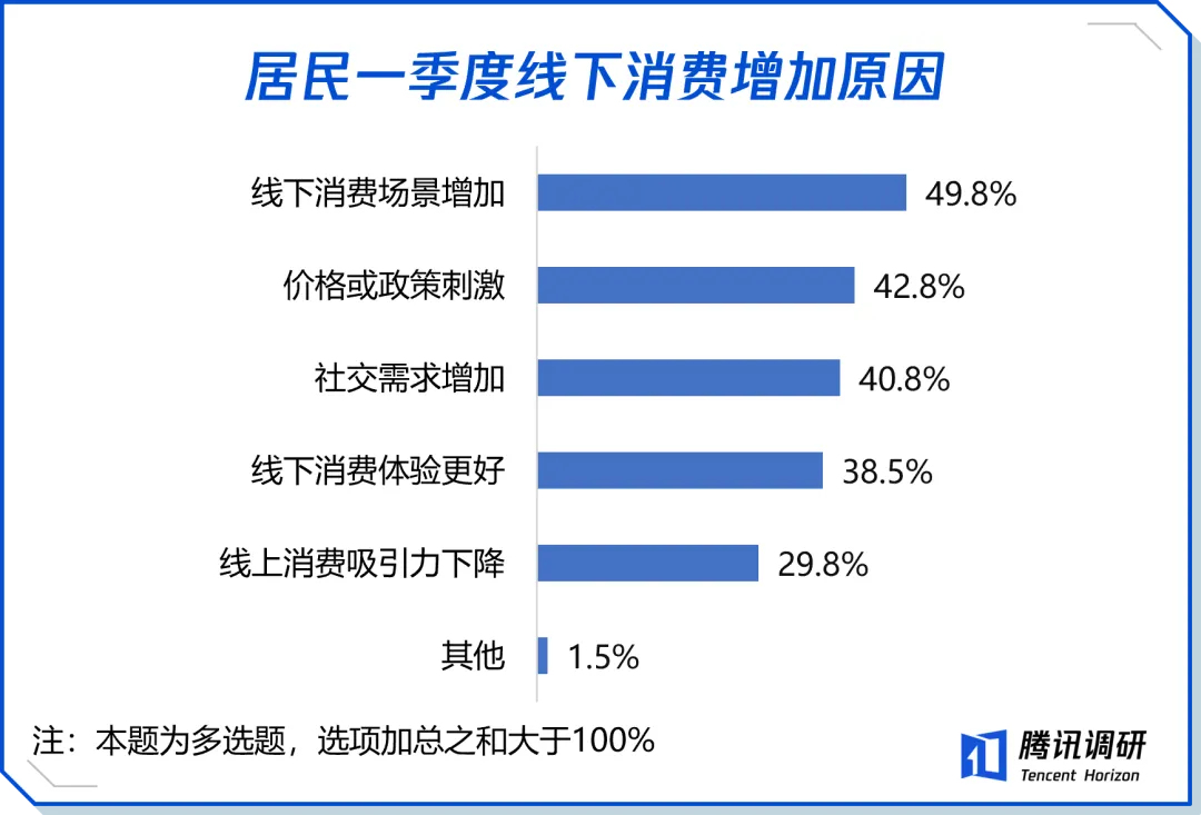 这一回暖势头背后,是多重因素的共同驱动。49.8%提到“线下消费场景增加”,42.8%表示受到“价格或政策刺激”,40.8%是“社交需求增加”,38.5%认为“线下消费体验更好”。这一变化与春节消费释放形成呼应。一季度居民消费的回暖,既有节庆因素带动,也有线下消费场景持续修复和服务型消费升温的支撑。