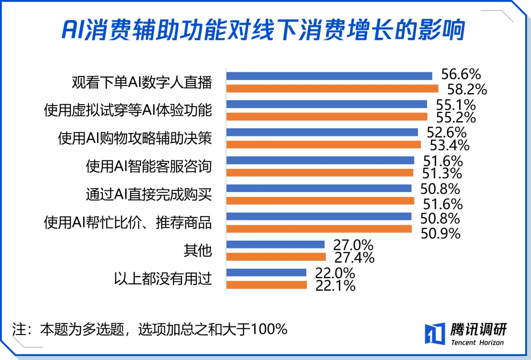 AI工具正在线下消费决策链条中发挥辅助作用。调研显示,使用过AI比价推荐、攻略测评、虚拟试穿等功能的人群,线下消费频率、消费金额增加的占比均超50%,较未使用AI的人群高出一倍以上,说明AI并未替代线下消费,而是在信息获取、比较筛选和体验预演等环节中,逐步成为连接线上决策与线下到店的桥梁。