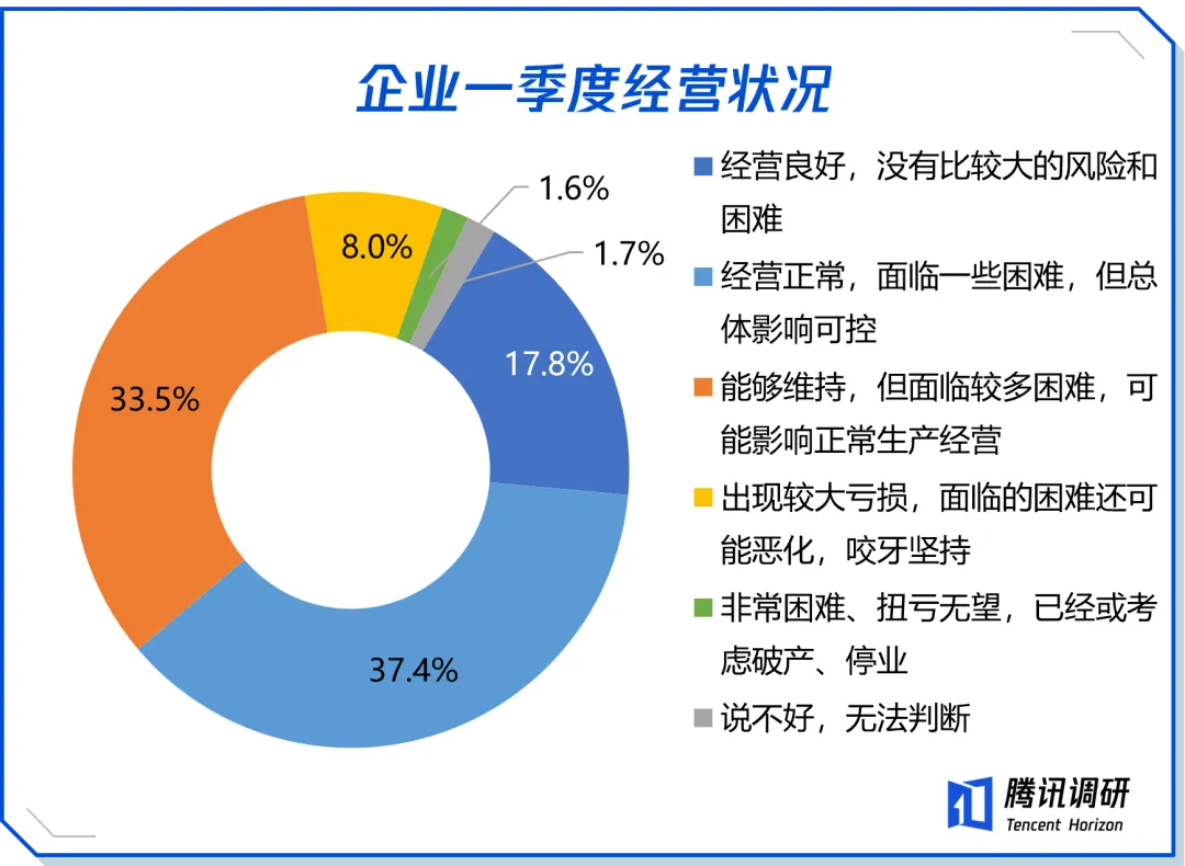 调研显示,在企业经营状况方面,一季度“经营良好”和“经营正常”的合计占55.2%,说明企业整体基本盘仍然稳定;“能够维持但面临较多困难”的占比为33.5%,“出现较大亏损”与“极为困难”的合计约9.6%,企业压力主要集中在中间层。