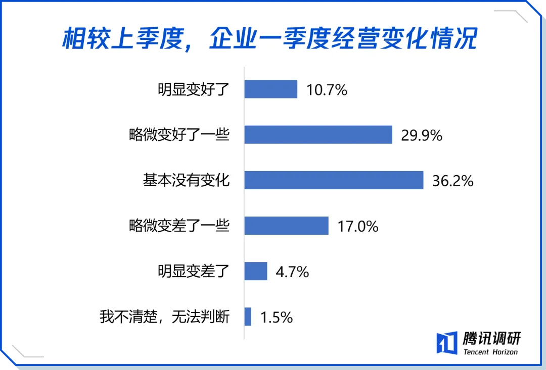 与去年四季度相比,企业经营情况在温和改善。经营“明显变好”与“略微变好”合计占40.7%,“基本没有变化”占36.2%,“略微变差”和“明显变差”合计占21.7%。