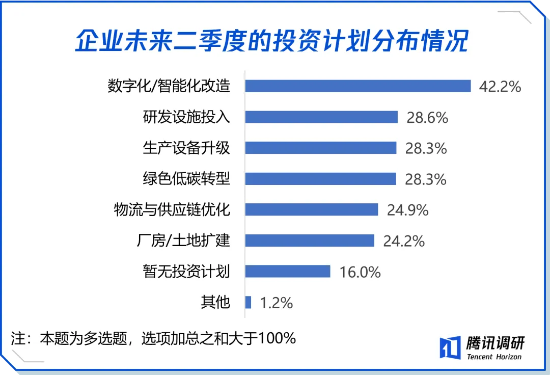 调研显示,84.0%的企业表示未来一季度内有投资安排,其中数字化/智能化改造占42.2%,仍是企业投资的核心首位;生产设备升级、绿色低碳转型、研发设施投入均在28%左右。企业投资正更多流向直接提升效率和竞争力的领域,数字智能化已成为较为明确的主线。