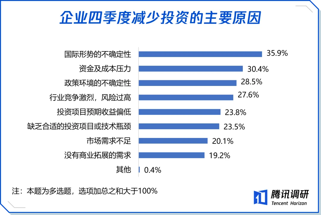 减少投资的首要原因是国际形势不确定性(35.9%),其后是资金成本压力(30.4%)、政策环境不确定性(28.5%)和行业竞争风险(27.6%)。企业投资当前更重确定性、回报率和风险控制。