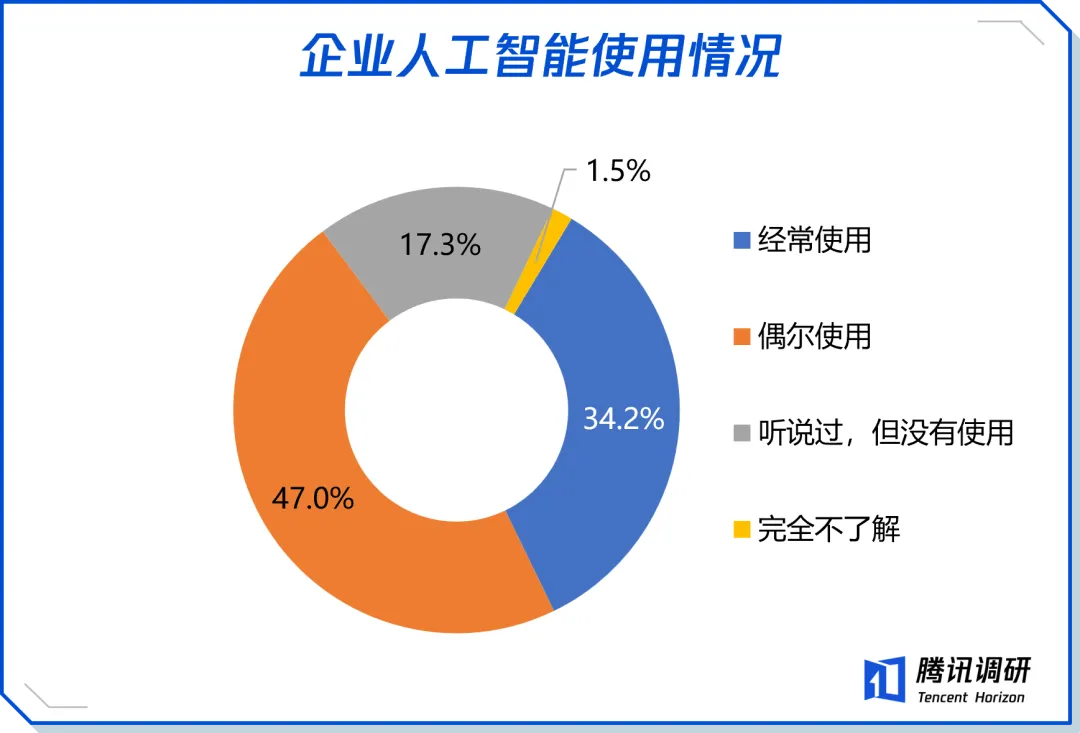 调研显示,人工智能在企业侧的渗透整体覆盖较高,超8成的受访企业表示已经使用人工智能工具,其中34.2%经常使用,47.0%偶尔使用。