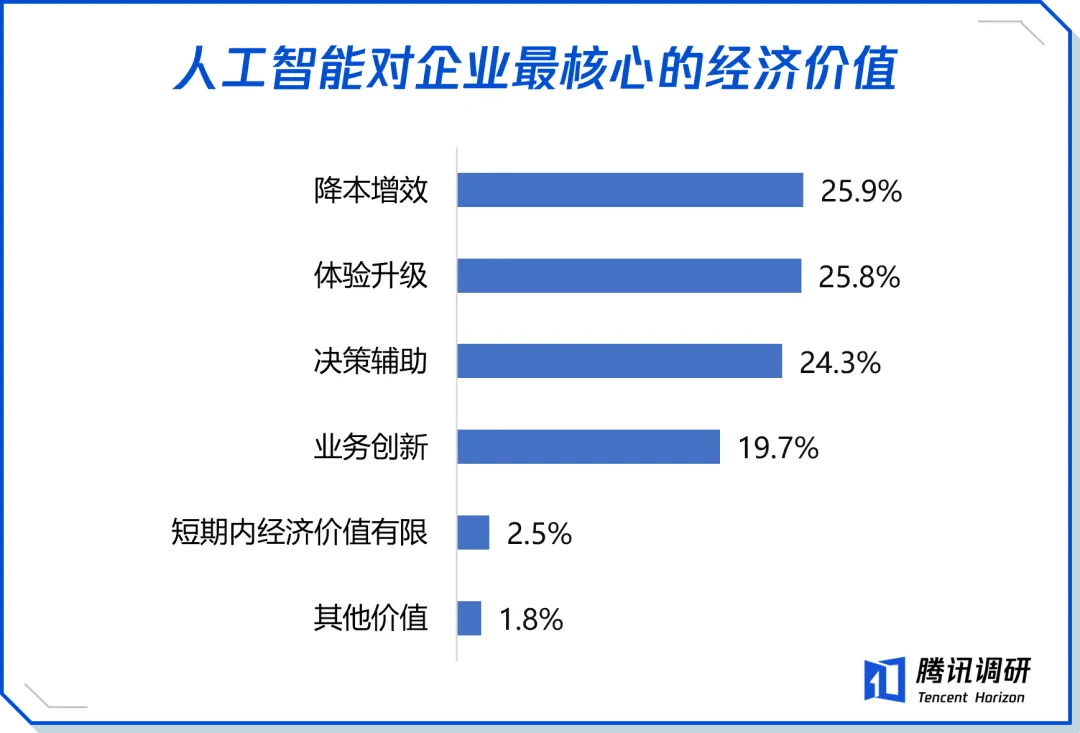 调研显示,在人工智能经济价值认知上,“体验升级”(25.9%)、“决策辅助”(24.3%)、“业务创新”(19.7%)的分布较为均衡,说明人工智能正在从单一的提效工具,逐步演变为支撑企业客户服务、经营决策与业务拓展的综合能力载体。