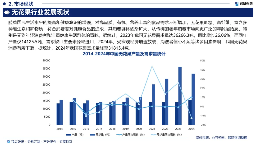 需求量:随着国民生活水平的提高和健康意识的增强,对高品质、有机、营养丰富的食品需求不断增加,无花果低糖、高纤维,富含多种维生素和矿物质,符合消费者对健康食品的追求,其消费群体逐渐扩大,从传统的老年消费市场向更广泛的年龄层拓展,特别是受到年轻消费者和注重健康生活群体的青睐,据统计,2023年我国无花果需求量达36266.3吨,同比增长26.06%,而同年产量仅14125.5吨,需求缺口主要来源地进口,2024年,受宏观经济增速放缓、消费者信心不足等诸多因素影响,我国无花果消费有所下滑,据统计,2024年我国花果需求量降至31815.4吨。