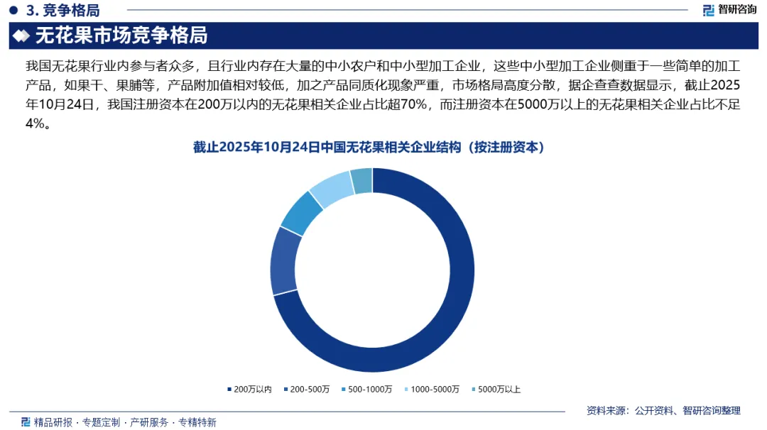 市场竞争格局:我国无花果行业内参与者众多,且行业内存在大量的中小农户和中小型加工企业,这些中小型加工企业侧重于一些简单的加工产品,如果干、果脯等,产品附加值相对较低,加之产品同质化现象严重,市场格局高度分散,据企查查数据显示,截止2025年10月24日,我国注册资本在200万以内的无花果相关企业占比超70%,而注册资本在5000万以上的无花果相关企业占比不足4%。