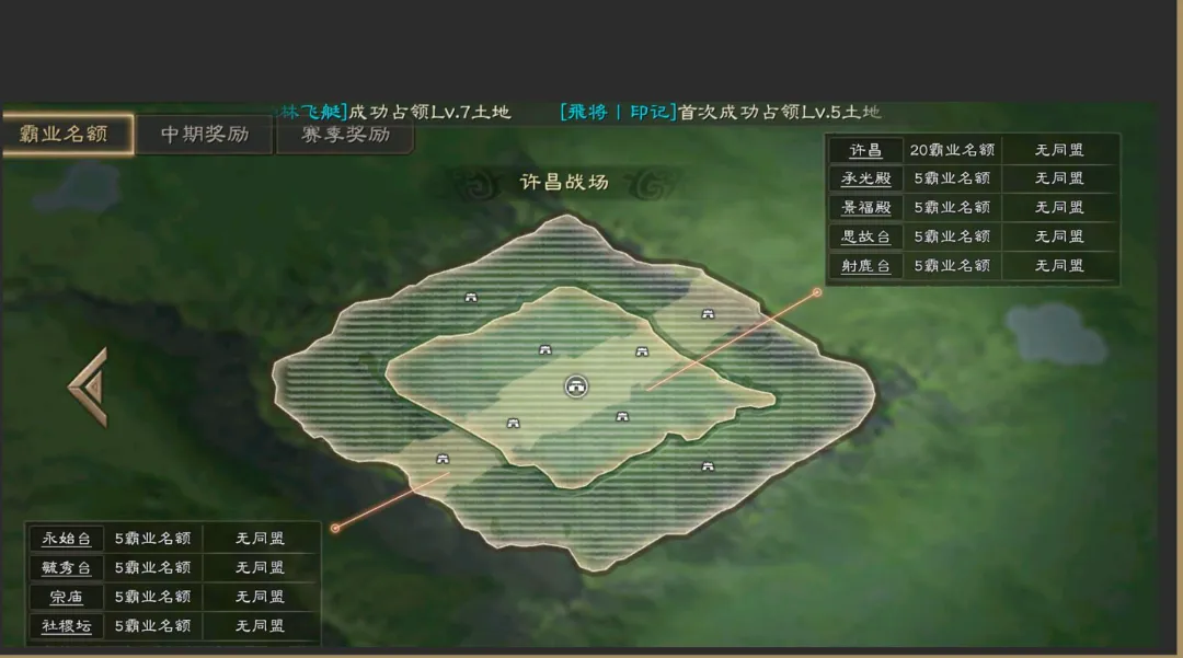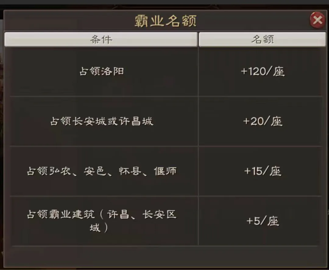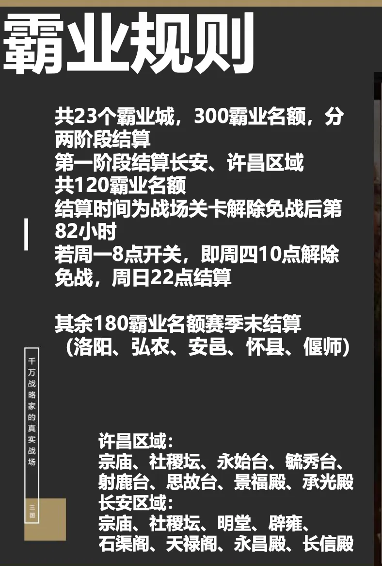本次剧本霸业名额分双阶段结算,核心卖点之一就是前期速抢红利:战场关卡解免战后 82 小时,结算长安、许昌区域 120 个名额,赛季末再瓜分洛阳、弘农等区域 180 个名额。占领洛阳直接 + 120 名额,长安 / 许昌各 + 20,弘农等四城各 + 15,宗庙、社稷坛等霸业建筑各 + 5,名额叠加轻松拉开差距。