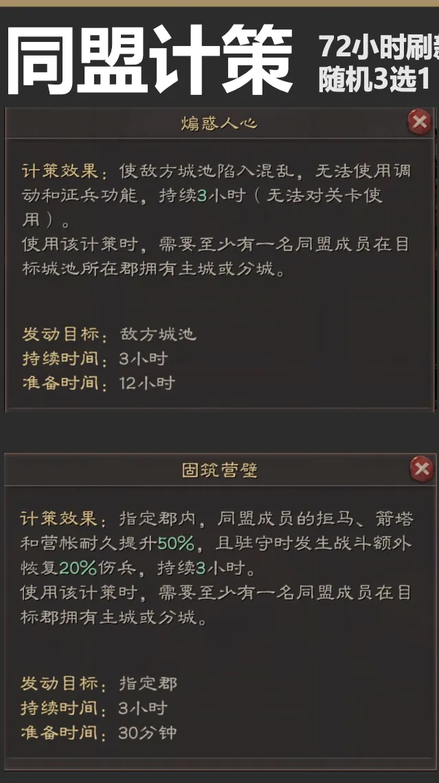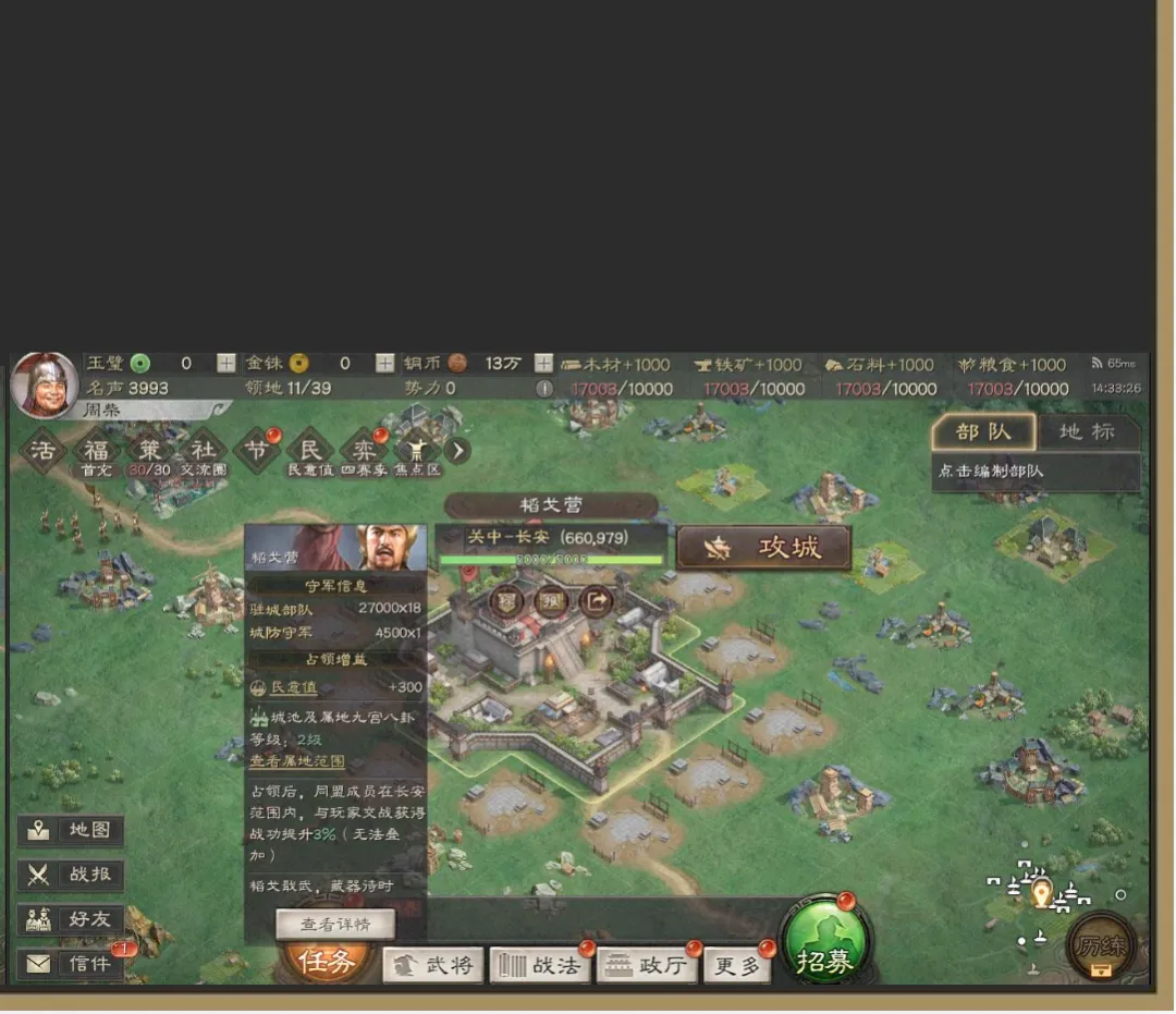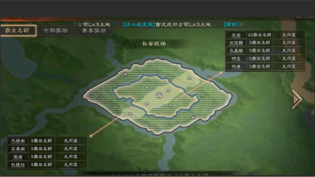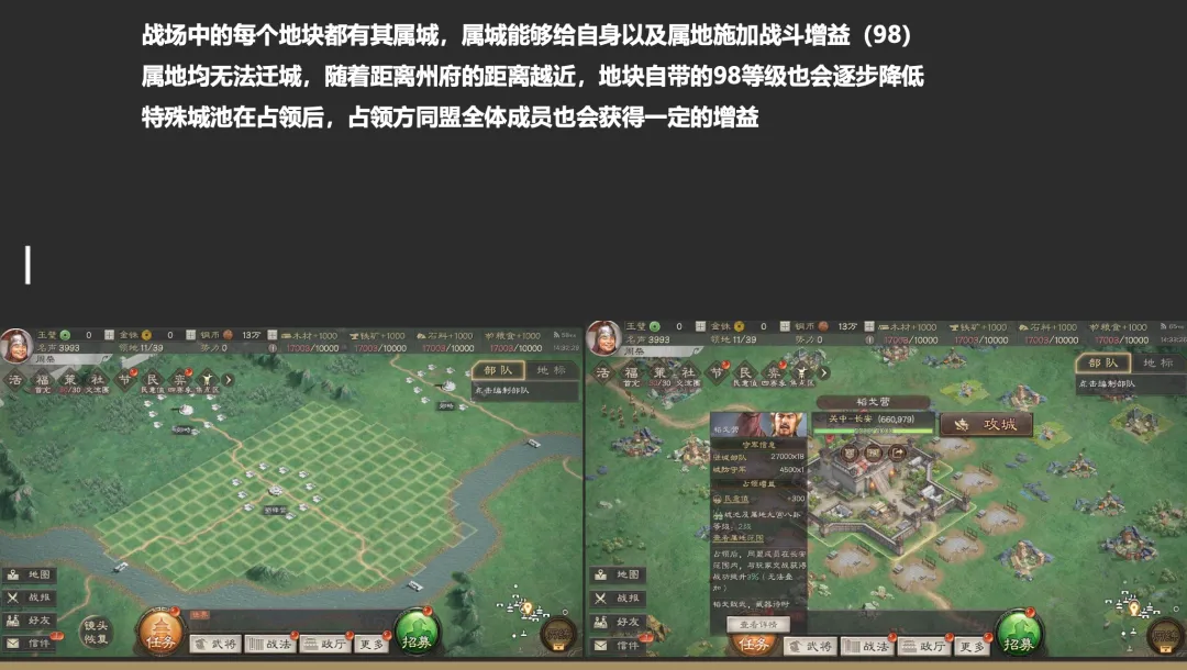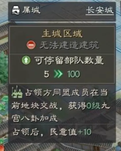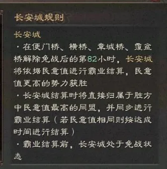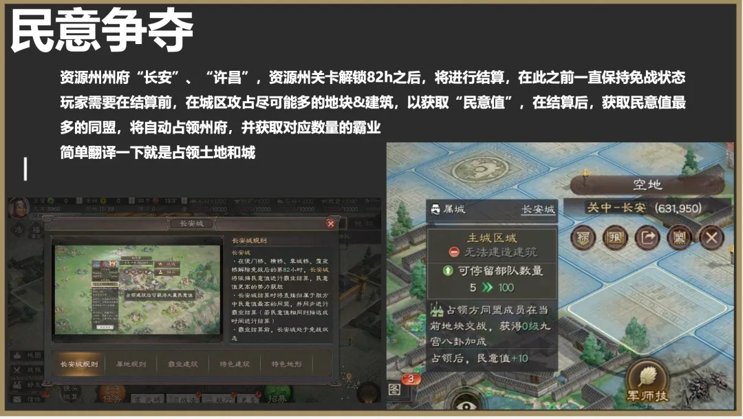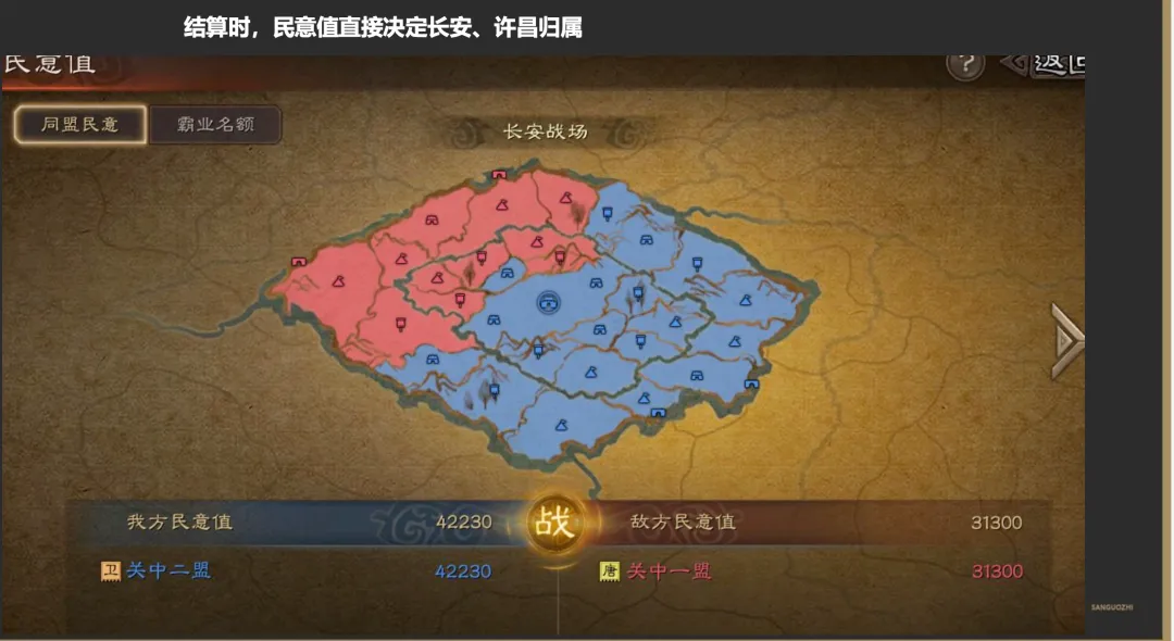民意争夺是长安、许昌的制胜关键,结算前攻占州府周边地块与建筑积累民意值,数值最高同盟直接占领州府并解锁对应名额,地块越近增益越高,属城还能给部队加战斗 buff,前期抢地节奏直接决定中期优势。