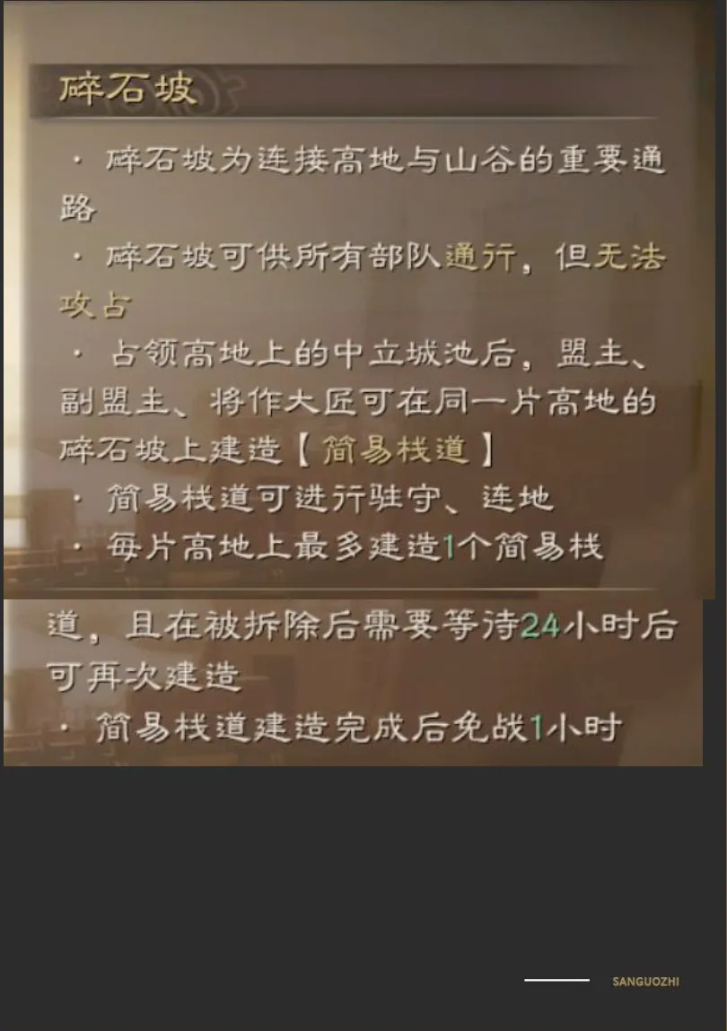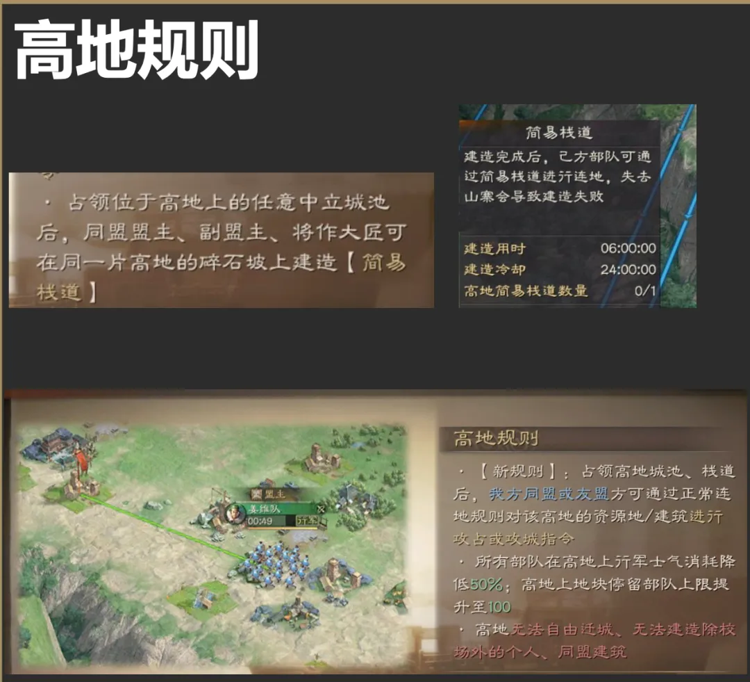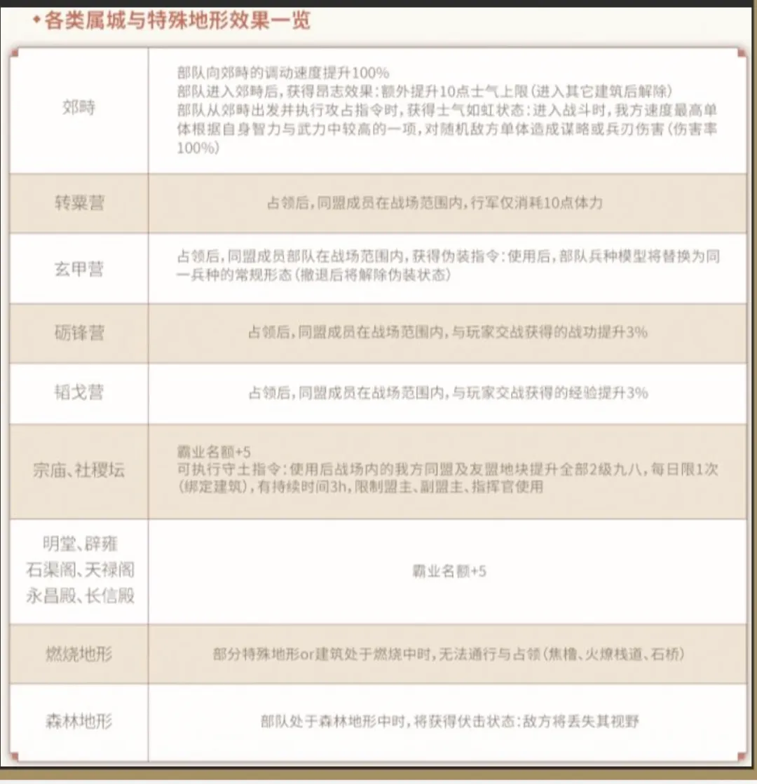 战场玩法亮点十足,特色地形与建筑打造多元战术:燃烧地形分割战场阻敌推进,森林地形触发伏击让敌方丢失视野;占领转票营行军仅耗 10 体力,玄甲营解锁部队伪装,宗庙社稷坛还能提升地块等级,高地规则下建造简易栈道,可实现高地连地、行军士气消耗减半,战术灵活性拉满。