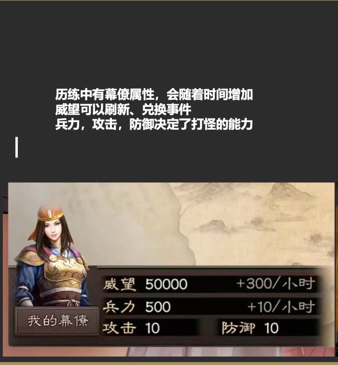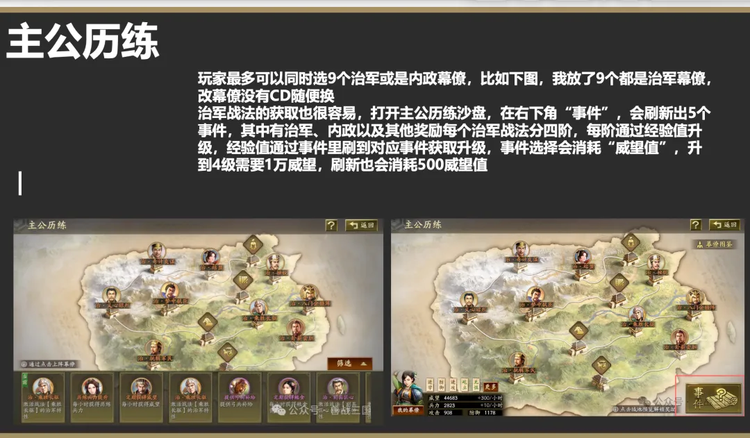 全新主公历练玩法来袭,9 个幕僚自由搭配,治军战法四阶升级 + 异化效果,内政幕僚稳提资源和补给。同盟计策 72 小时刷新,全军出击、煽惑人心等计策轻松制敌,还有四阶段历练提案,从资源增益到部队强化,层层解锁助力霸业!