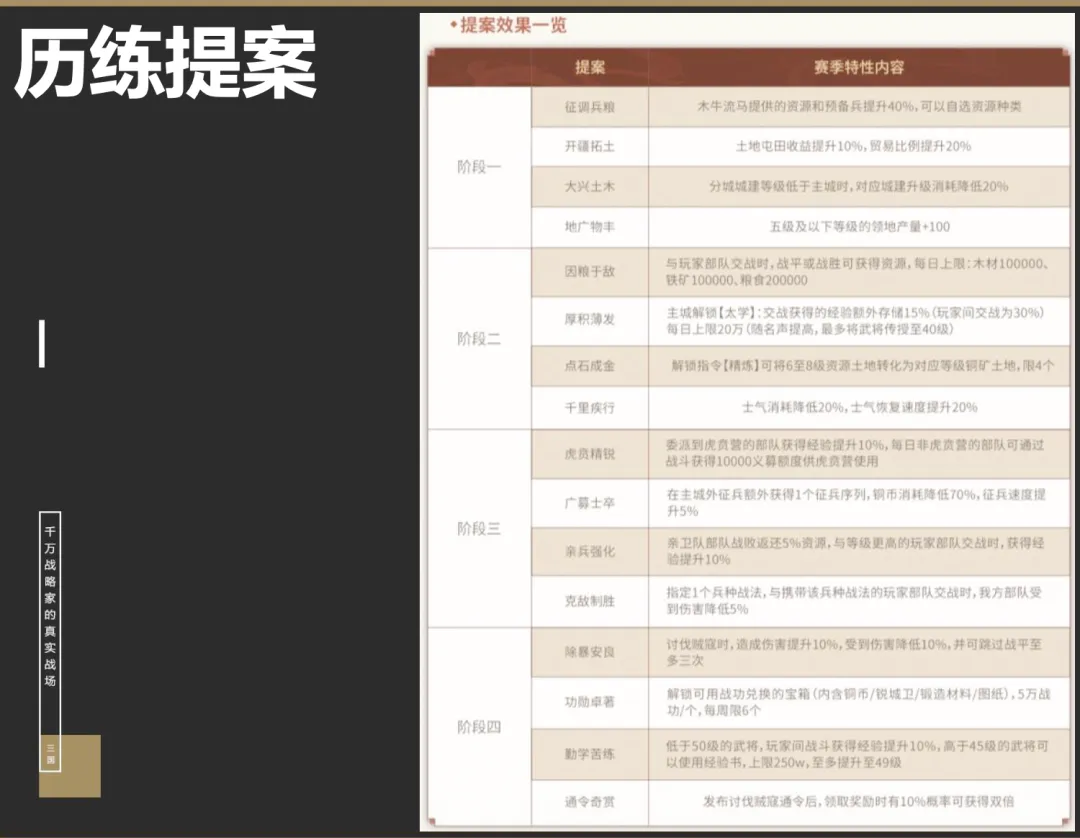 此外,四阶段历练提案层层解锁赛季福利,从木牛流马资源翻倍、土地产量提升,到征兵加速、兵种战法克制减伤,全程为霸业争夺赋能,不同阶段选择适配提案,资源与战力双重提升。