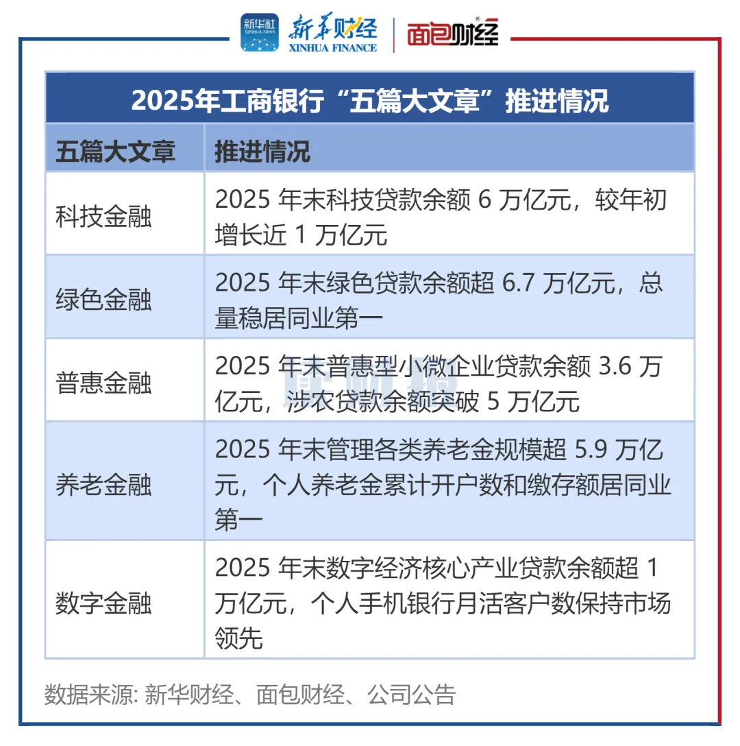 科技金融方面,工商银行完善“五专”服务机制,推出“研发贷”“创新积分贷”“颠覆性技术创新专项贷”等特色融资场景,2025 年末科技贷款余额 6 万亿元,较年初增长近 1 万亿元,增速19.9%;绿色金融方面,2025 年末绿色贷款余额超 6.7 万亿元,总量稳居同业第一;普惠金融方面, 2025 年末普惠型小微企业贷款余额 3.6 万亿元,涉农贷款余额突破 5 万亿元;养老金融方面,2025 年末管理各类养老金规模超 5.9 万亿元,个人养老金累计开户数和缴存额居同业第一;数字金融方面,建成千亿参数金融大模型“工银智涌”,2025 年末数字经济核心产业贷款余额超 1 万亿元,个人手机银行月活客户数保持市场领先。