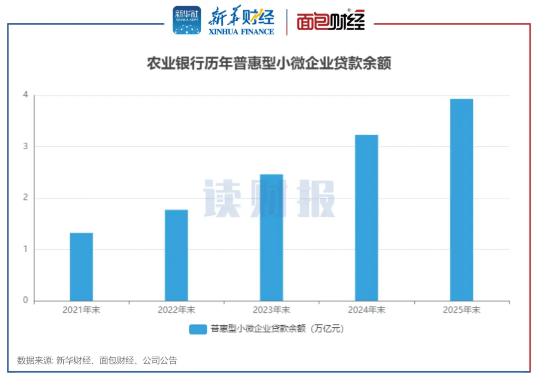 截至 2025 年末,农业银行普惠贷款余额 4.35 万亿元,较上年末增长 20.9%;普惠型小微企业贷款余额 3.93 万亿元,较上年末增长 21.7%;普惠型小微企业有贷客户数 523.94 万户,较上年末增加 65.75 万户。