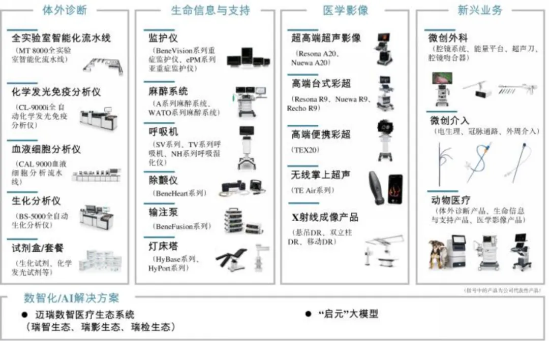 公司主要从事医疗器械的研发、制造、营销及服务,主要产品覆盖四大领域:生命信息与支持、体外诊断、医学影像,以及新兴业务(如微创外科、微创介入、动物医疗等),拥有国内同行业中最全产品线。